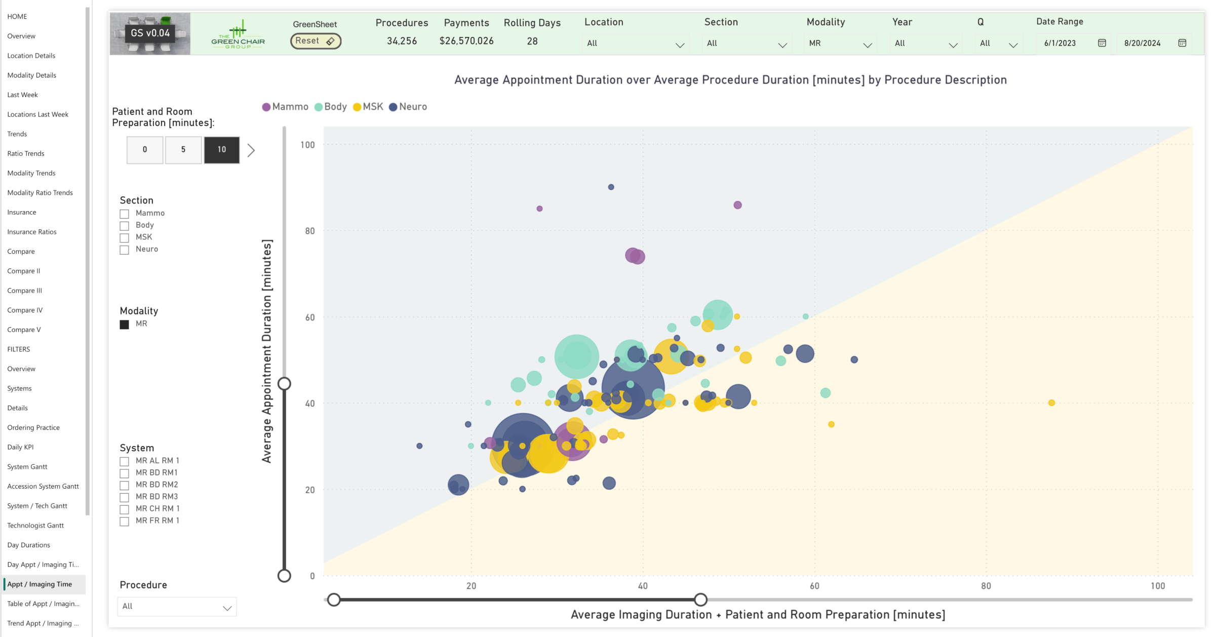 The GreenSheet compares scheduled versus actual MRI exam times. Each bubble represents a specific MRI procedure (e.g., Brain MRI with and without contrast), with bubble size indicating procedure count. Ten minutes are included to account for patient handling and positioning. Ideally, all bubbles align along a line where the scheduled time matches the actual exam duration (plus patient handling time).
