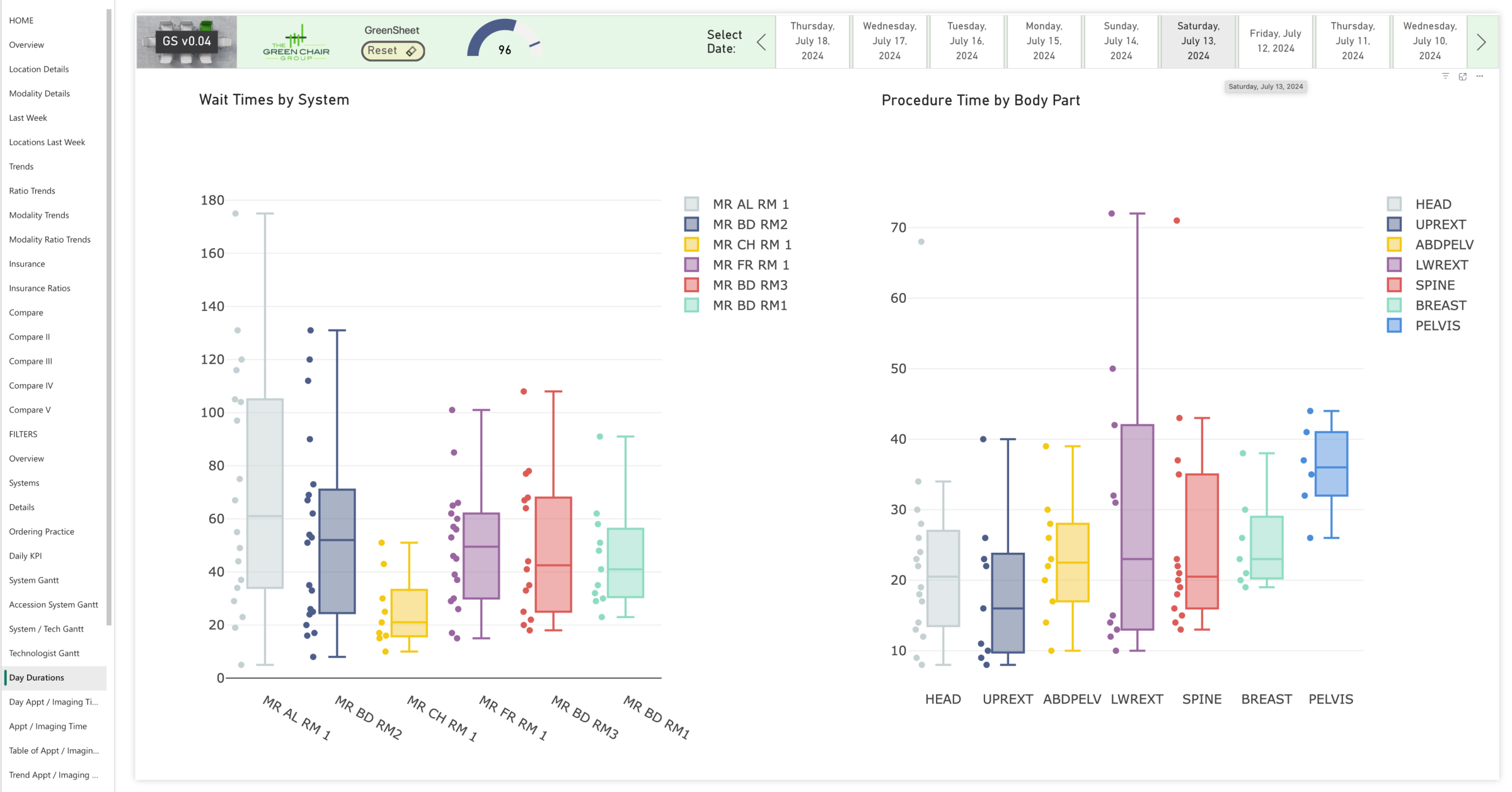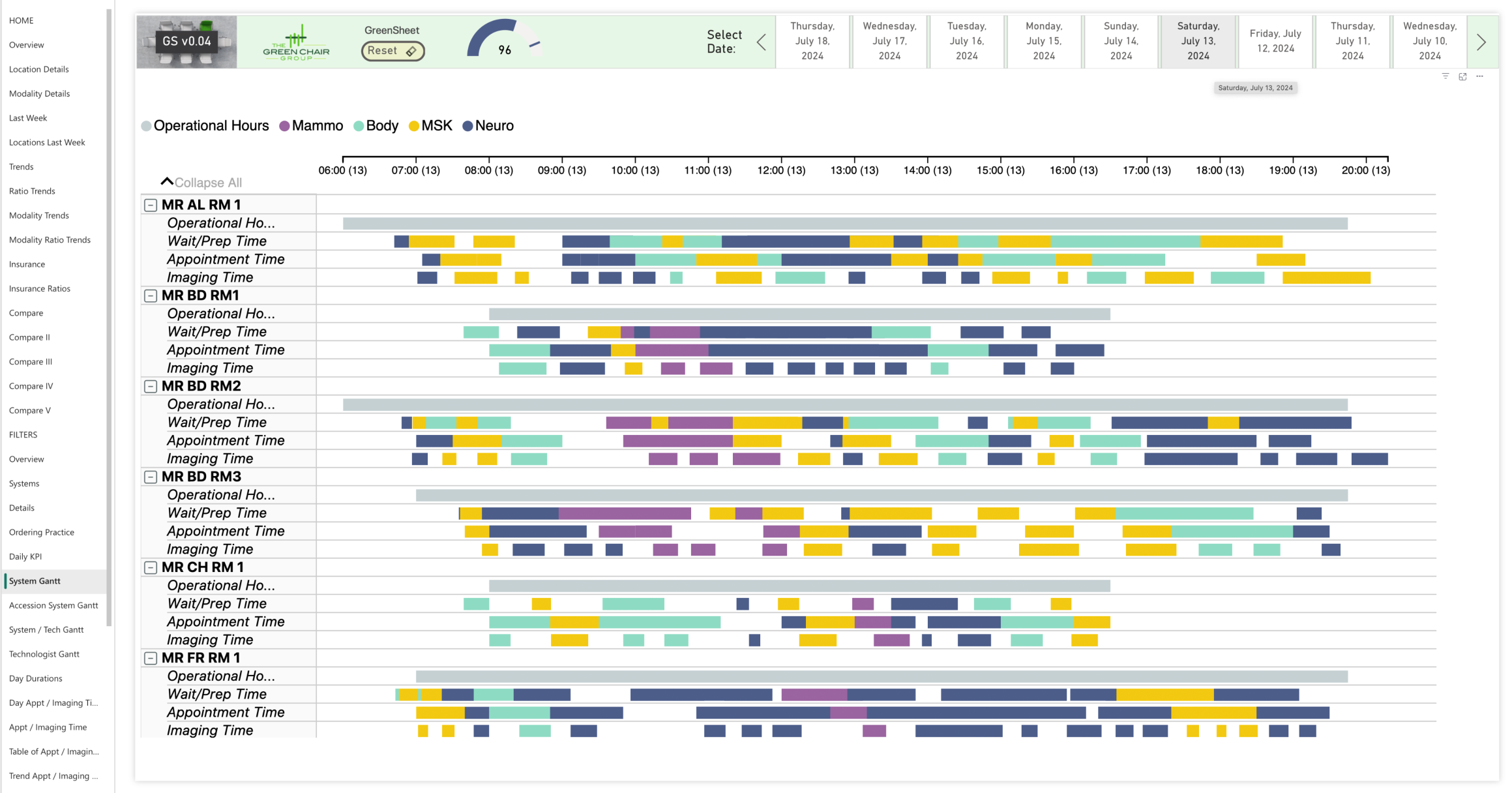 The GreenSheet provides an in-depth analysis of all scanning-related aspects across every scanner and operational hour for a healthcare institution. The GreenSheet evaluates operational hours, patient scheduling, wait and prep times, and scan durations to identify and address inefficiencies and bottlenecks.