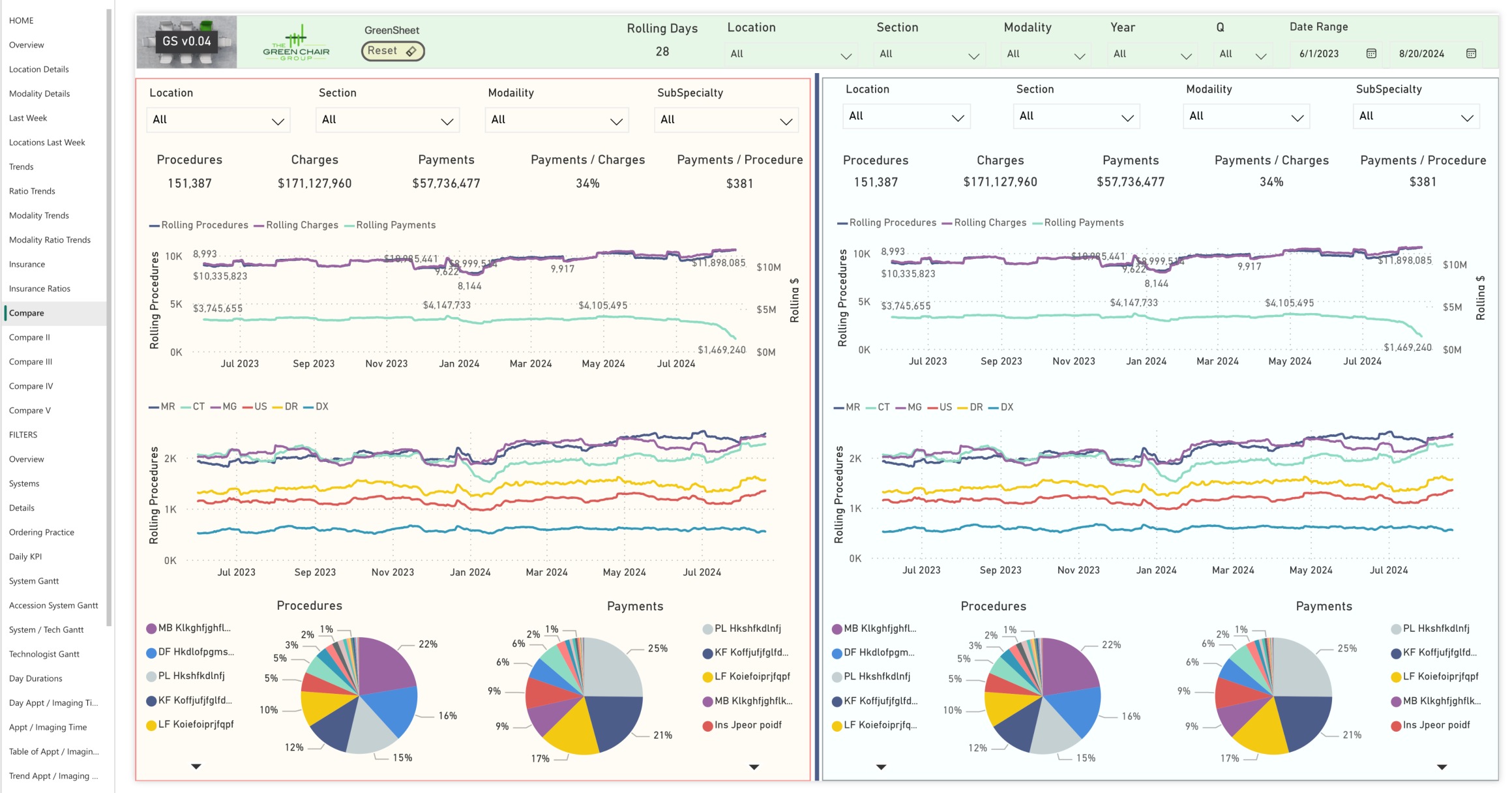 This figure is the first of four pages comparing two sets of data. The GreenSheet enables comparisons across clinical sections, subspecialties, institutional locations, and more, empowering informed decisions on service adjustments and expansion areas to maximize clinical, operational, logistical, and financial performance.