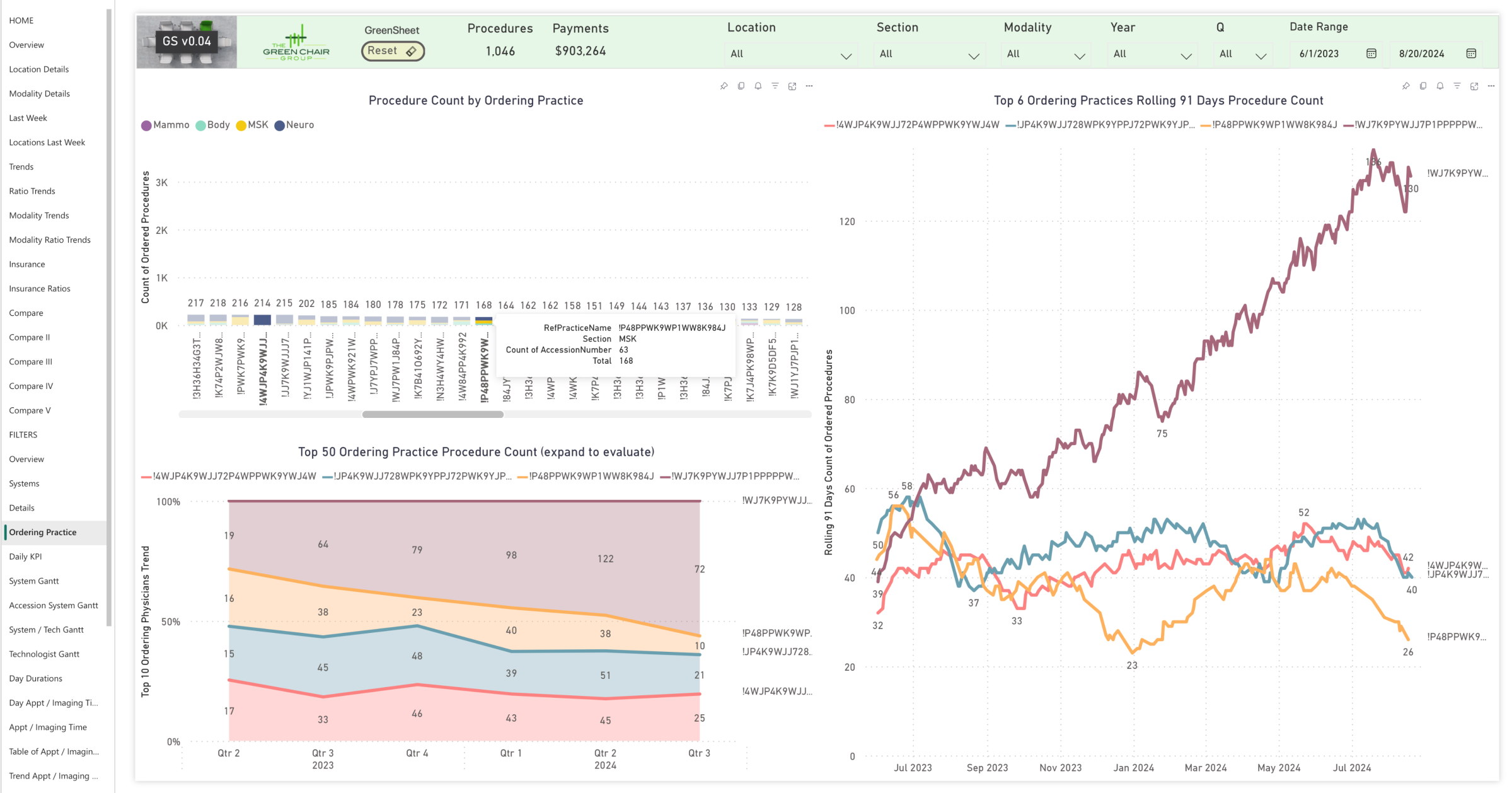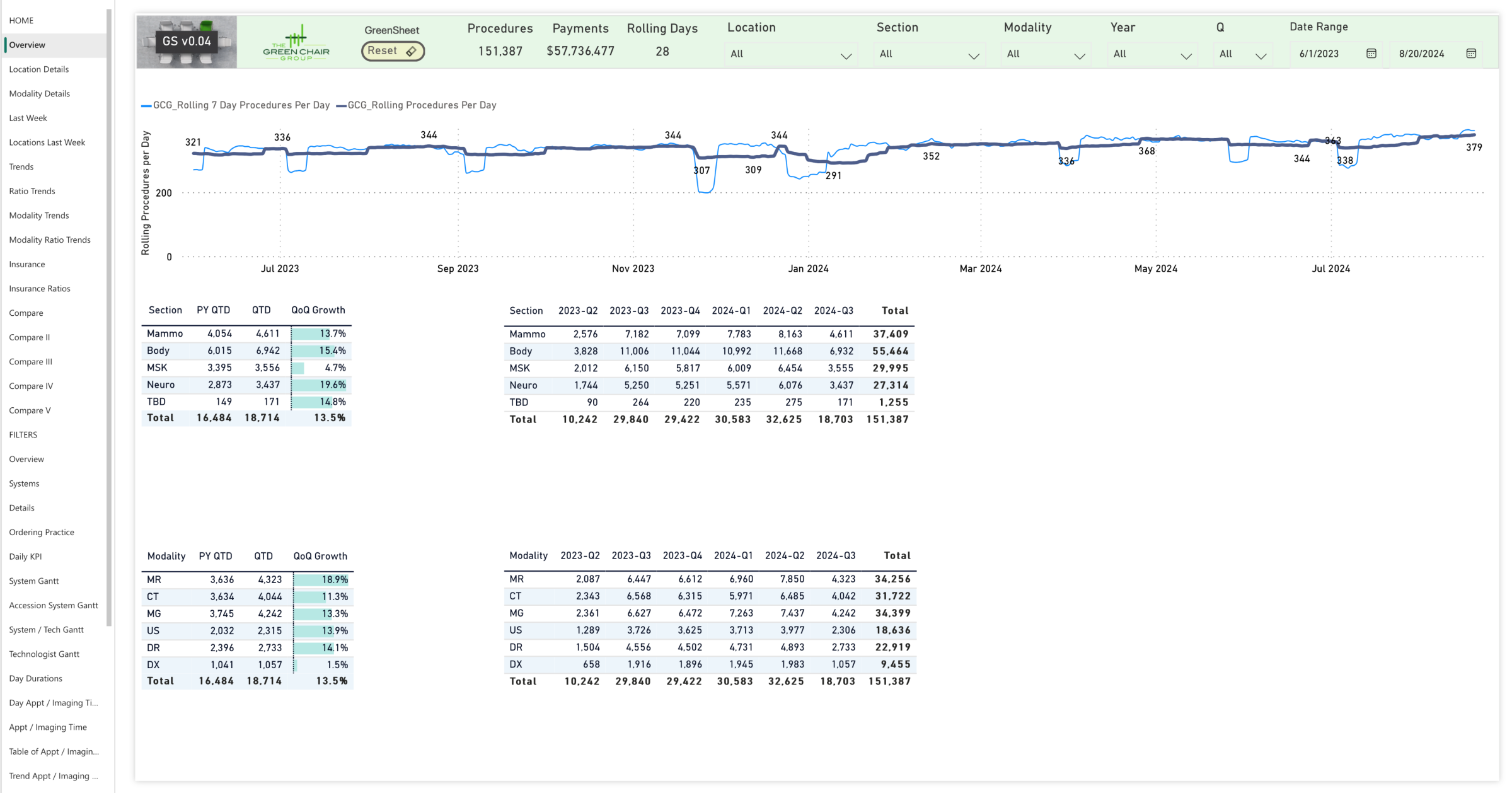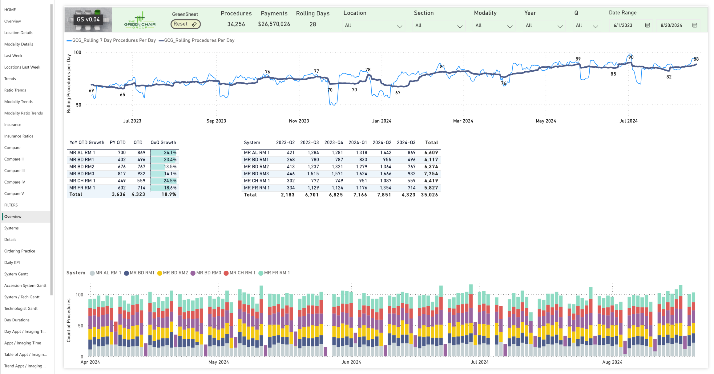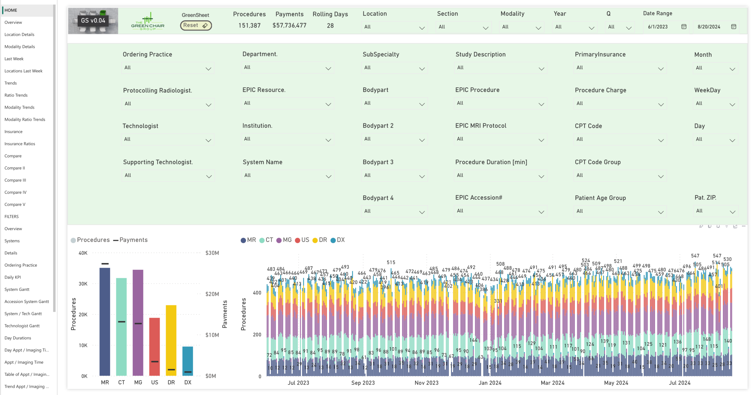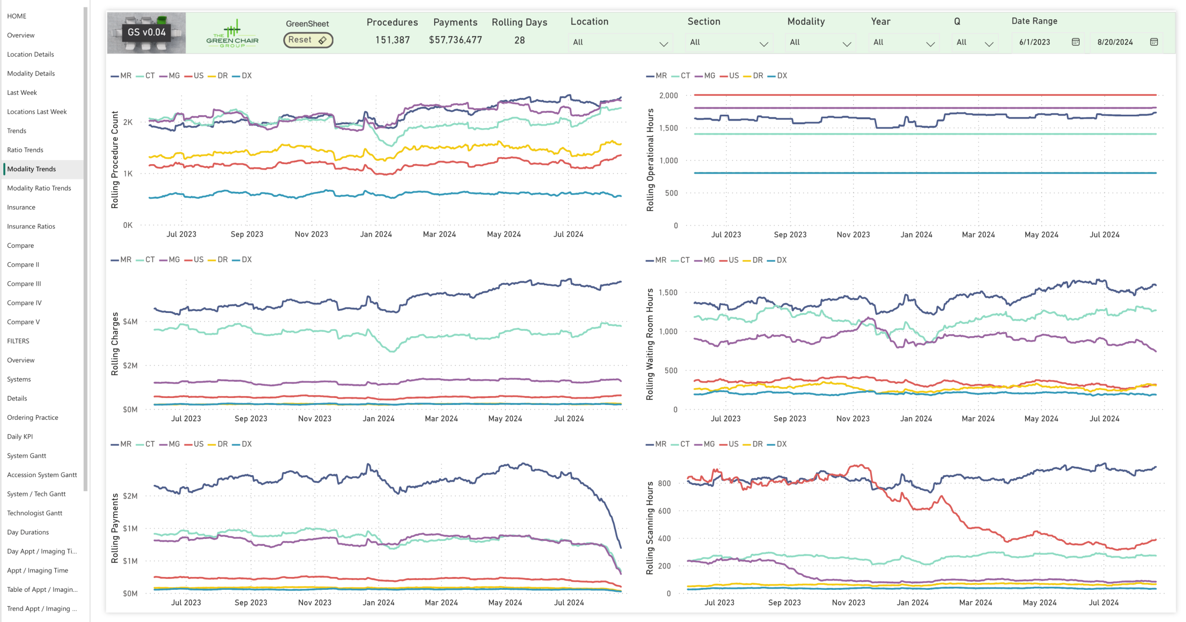 The Green Chair Group produces a proprietary, copyright-pending tool, the GreenSheet. The GreenSheet consists of over 40 interactive pages that use advanced analytics to enhance standard market tools by drilling deeper into data to identify bottlenecks and inefficiencies, particularly in MRI workflows.