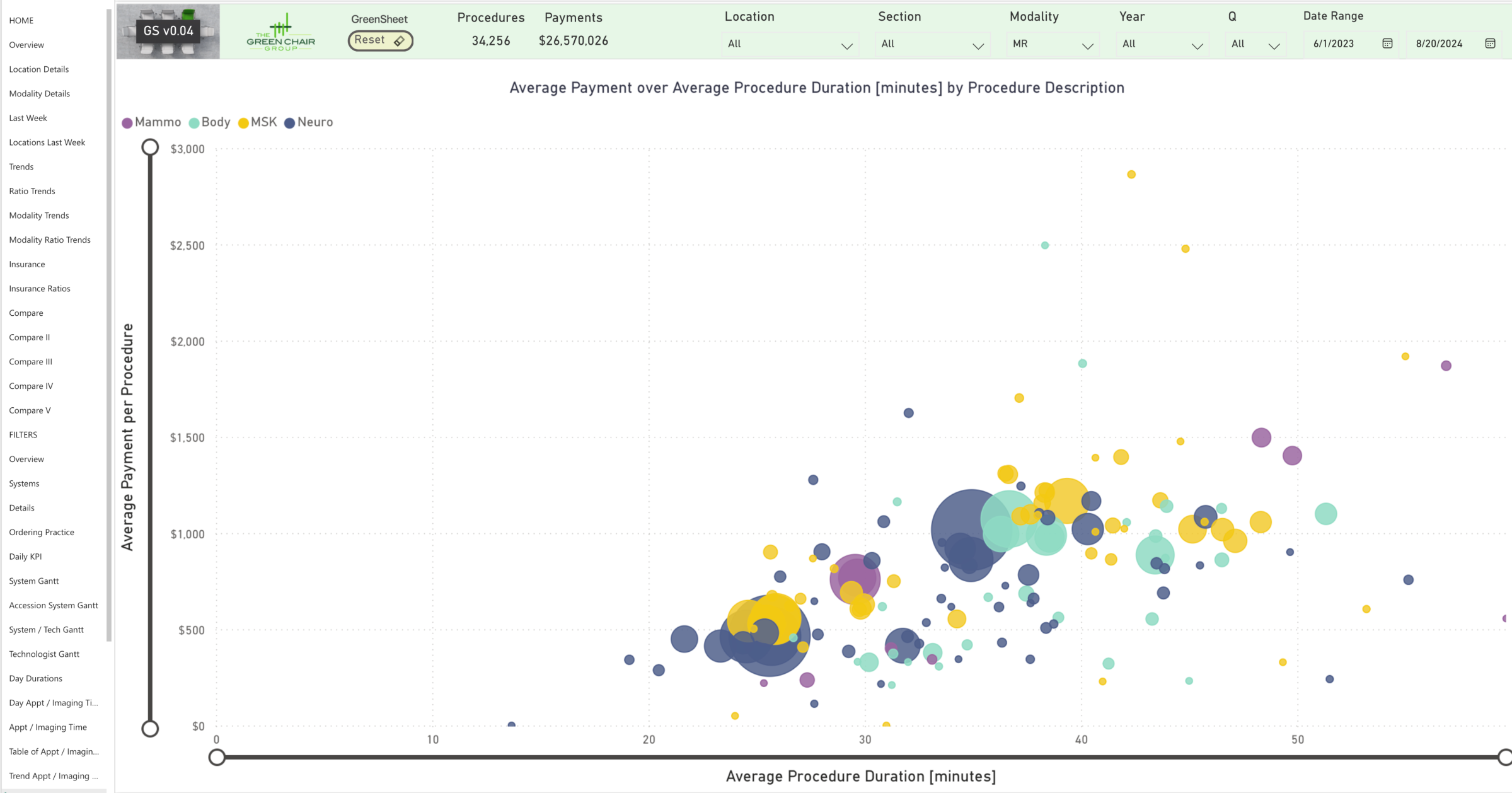 The GreenSheet compares procedure time with average reimbursement per procedure, with bubble size indicating procedure count. The chart illustrates the relationship between exam times and reimbursement.