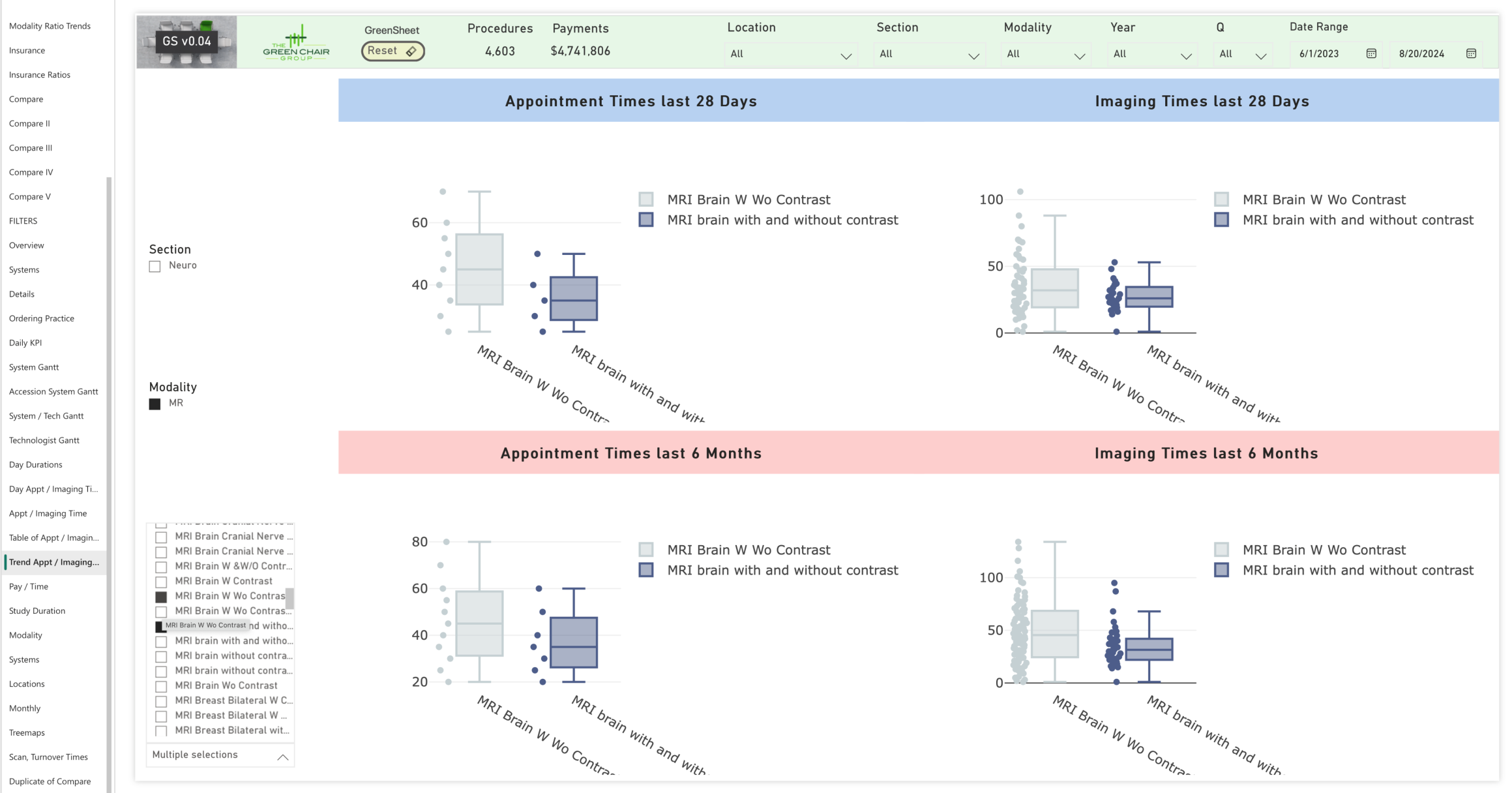This page of the GreenSheet visualizes operational improvements for brain MRIs with and without contrast over time. On the left side, graphs show scheduled exam durations, where the recent four weeks (top left) have more consistent and shorter scheduling compared to the broader six-month range (bottom left).