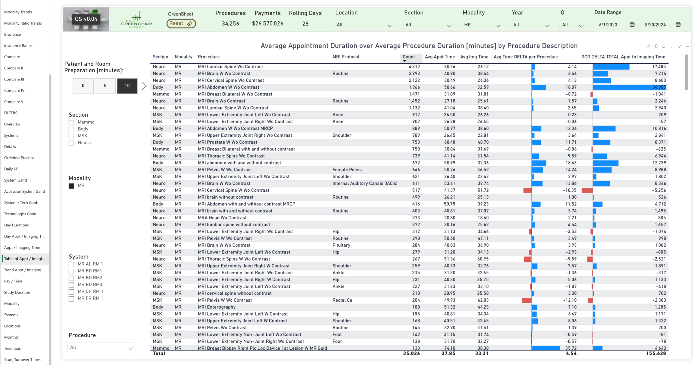 The customizable interface allows users to select any combination of specific focus areas (MRI was selected for this example) to drill deeply into targeted data insights. Flexibility allows users to go beyond identifying overspending to pinpoint the root cause of inefficiencies or delays in operational performance across departments, locations, or processes. The Green Chair Group then assesses the findings to propose concrete operational improvements.
