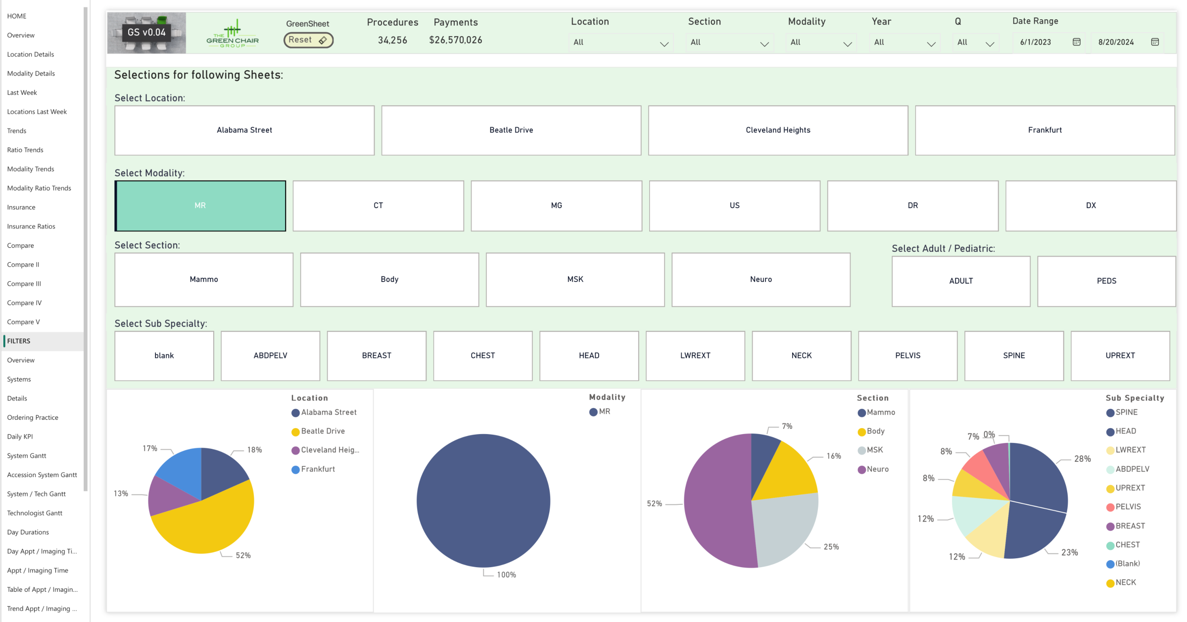 The Green Chair Group produces a proprietary, copyright-pending tool, the GreenSheet. The GreenSheet consists of over 40 interactive pages that use advanced analytics to enhance standard market tools by drilling deeper into data to identify bottlenecks and inefficiencies, particularly in MRI workflows.